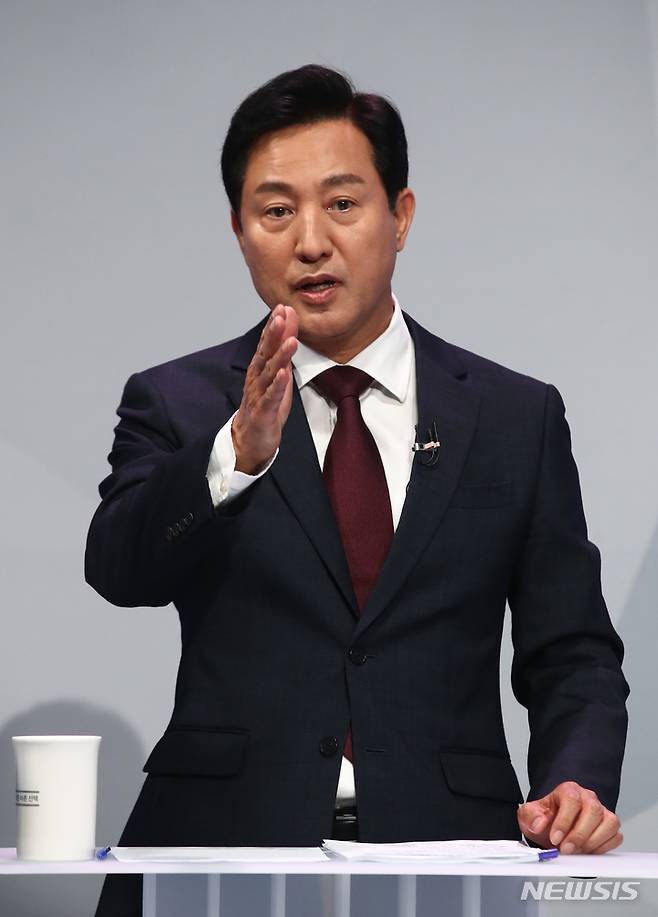 [서울=뉴시스] 국회사진기자단 = 오세훈 국민의힘 서울시장 후보가 26일 서울 마포구 상암동 MBC 스튜디오에서 열린 서울시장 후보자 TV 토론회를 준비하고 있다. 2022.05.26. photo@newsis.com