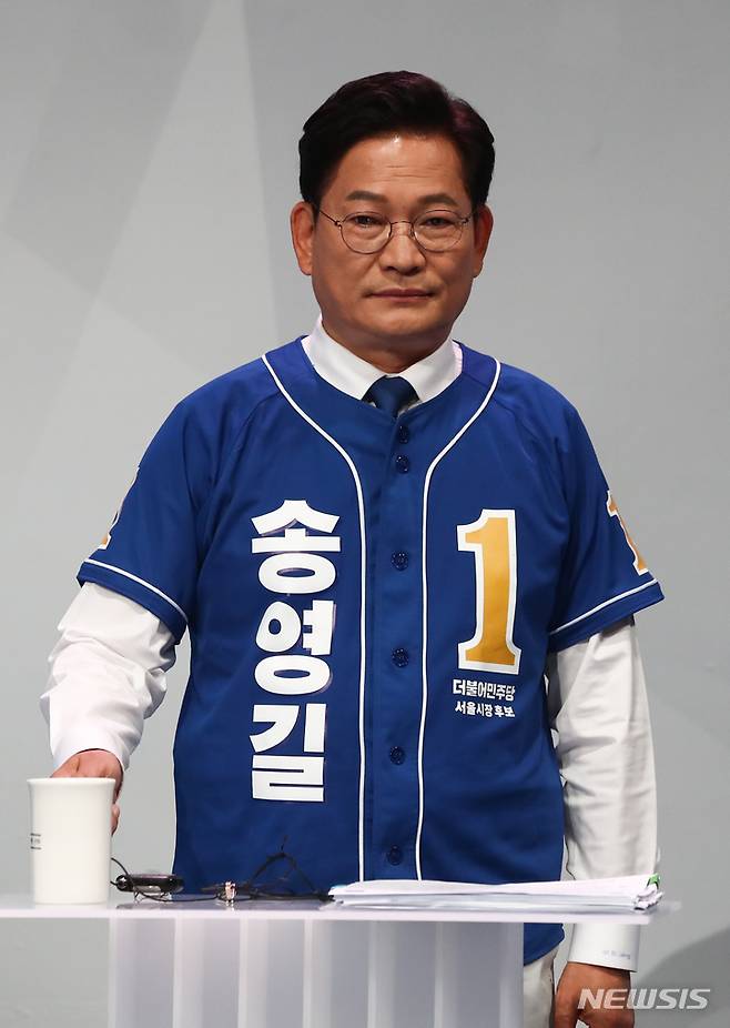 [서울=뉴시스] 국회사진기자단 = 송영길 더불어민주당 서울시장 후보가 26일 서울 마포구 상암동 MBC 스튜디오에서 열린 서울시장 후보자 TV 토론회를 준비하고 있다. 2022.05.26. photo@newsis.com