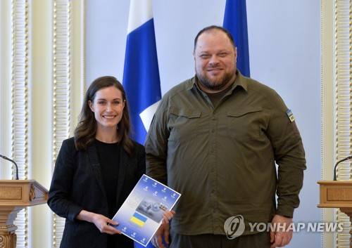 epa09977426 Finnish Prime Minister Sanna Marin (L) and Ukrainian Parliament Speaker Ruslan Stefanchuk (R) pose for a photo during a meeting in Kyiv, Ukraine, 26 May 2022. Marin visits Ukraine for the first time amid the Russian invasion. Finland's Parliament on 17 May approved the country's application for NATO membership as a result of Russia's invasion of Ukraine. On 24 February, Russian troops invaded Ukrainian territory starting a conflict that has provoked destruction and a humanitarian crisis. EPA/ANDRII NESTERENKO