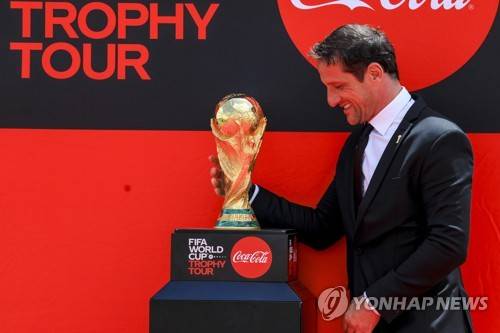 epa09977437 Former Brazilian soccer player Juliano Belletti poses for a photo after walking down from the FIFA World Cup Tour plane holding the FIFA World Cup Trophy after landing at the Jomo Kenyatta airport in Nairobi, Kenya, 26 May 2022. The trophy will be paraded on 27 May in Nairobi. The public and invited guests will get a chance to view and take a photo with it. During the worldwide Tour of the Trophy, it is expected that the Cup will be shown in at least 22 countries. EPA/Daniel Irungu