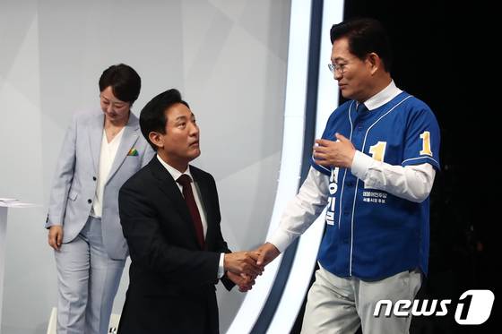 (서울=뉴스1) 국회사진취재단 = 26일 서울 상암 MBC스튜디오에서 열린 서울특별시장 선거 후보자 토론회에서 오세훈 국민의힘 후보(가운데)와 송영길 더불어민주당 후보가 인사하고 있다. 2022.5.26/뉴스1