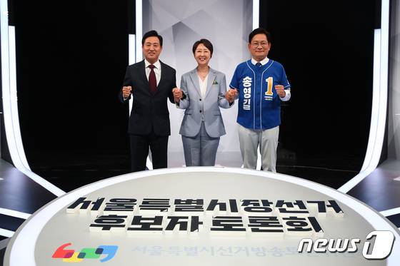 (서울=뉴스1) 국회사진취재단 = 6.1 지방선거 서울시장 후보들이 26일 서울 상암 MBC스튜디오에서 열린 서울특별시장 선거 후보자 토론회에 앞서 기념촬영을 하고 있다. 왼쪽부터 국민의힘 오세훈 후보, 정의당 권수정 후보, 더불어민주당 송영길 후보. 2022.5.26/뉴스1