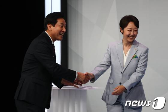 (서울=뉴스1) 국회사진취재단 = 26일 서울 상암 MBC스튜디오에서 열린 서울특별시장 선거 후보자 토론회에서 국민의힘 오세훈 후보(왼쪽)와 정의당 권수정 후보가 인사하고 있다. 2022.5.26/뉴스1