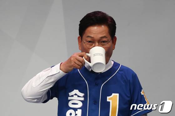 (서울=뉴스1) 국회사진취재단 = 송영길 더불어민주당 서울시장 후보가 26일 오후 서울 마포구 MBC에서 열린 서울시장 후보자 TV 토론회에서 물을 마시고 있다. 2022.5.26/뉴스1