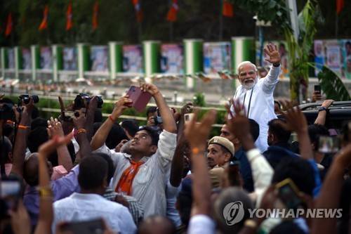 epa09977502 Indian Prime Minister Narendra Modi waves as he holds a roadshow while on his way to the Jawaharlal Nehru Stadium to launch various development works, in Chennai, India, 26 May 2022. Several people, school students, and Bharatiya Janata Party supporters gathered to welcome Indian Prime Minister Narendra Modi during his visit to Chennai, in the Southern state of Tamil Nadu to launch various development works. EPA/IDREES MOHAMMED