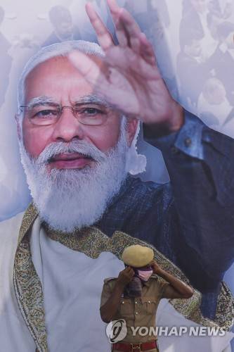 epa09977512 An Indian policeman stands in front of a billboard featuring Indian Prime Minister Narendra during his visit to Chennai to launch various development works, in Chennai, India, 26 May 2022. Several people, school students, and Bharatiya Janata Party supporters gathered to welcome Indian Prime Minister Narendra Modi during his visit to Chennai, in the Southern state of Tamil Nadu to launch various development works. EPA/IDREES MOHAMMED
