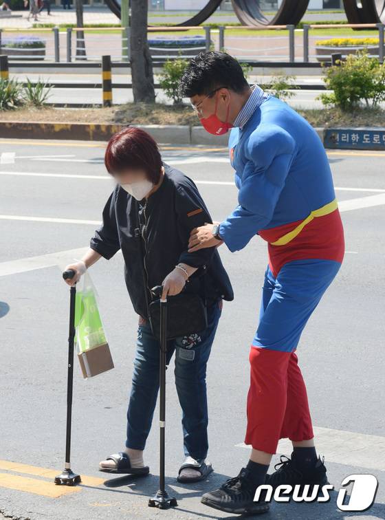 (대전=뉴스1) 김기태 기자 = 26일 대전 동구 용전동에서 정명국 국민의힘 시의원 후보가 슈퍼맨 복장을 입고 선거운동을 펼치고 있다.(정명국 선거캠프 제공) 2022.5.26/뉴스1