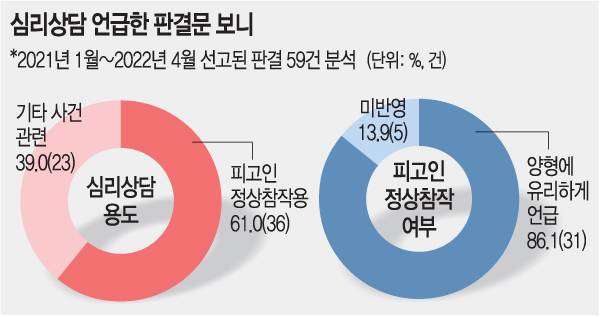 취재팀은 지난해 1월부터 지난달까지 공개된 성범죄 관련 판결문 중 ‘심리상담’이 언급된 59건을 분석했다. 적어도 문구상으로는 심리상담 이력이 재범 방지나 갱생 노력으로 평가되고 있었다. 59건 중 피고인 정상참작용으로 심리상담이 제시된 사례는 36건이었다. 재판부는 그 중 86.1%인 31건에서 심리상담을 양형에 유리한 정상으로 기술했다. 이들 혐의는 몰카(11건) 음란물(9건) 추행(5건) 공연음란(3건) 미성년강간(3건) 등이었다.
