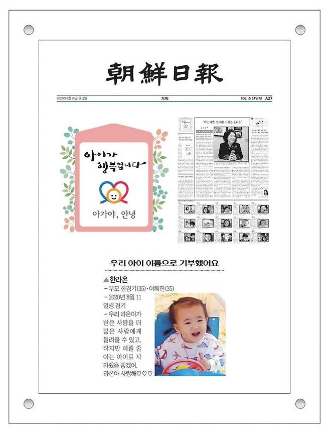 조선일보에 실린 우리 아기 출생 소식, 본인이나 지인의 인터뷰·사진 기사를 영원히 추억으로 간직하세요. 조선일보는 독자가 원하는 신문 지면을 그대로 고급 액자에 담아 드리는 ‘조선일보 리프린트’ 서비스를 시작했습니다. 매주 ‘아이가 행복입니다’ 지면에 소개된 한 가족을 추첨해 리프린트를 선물로 드립니다. 지난 20일 ‘우리 아이 이름으로 기부했어요’ 코너에 소개된 한경기·이혜진씨 부부의 자녀 라온<사진>이가 리프린트 경품의 이번 주 주인공입니다. 자세한 내용은 홈페이지(reprint.chosun.com)에서 확인할 수 있습니다.