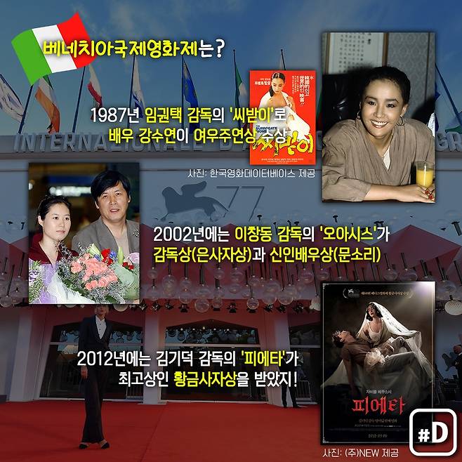 베네치아 영화제는 매년 8∼9월 열립니다. 첫 수상자는 1987년 강수연이었고, 2002년엔 이창동 감독의 '오아시스'가 감독상(은사자상)과 신인배우상(문소리)을 받았네요. 2012년엔 김기덕 감독의 '피에타'가 최고상인 황금사자상을 수상했습니다.