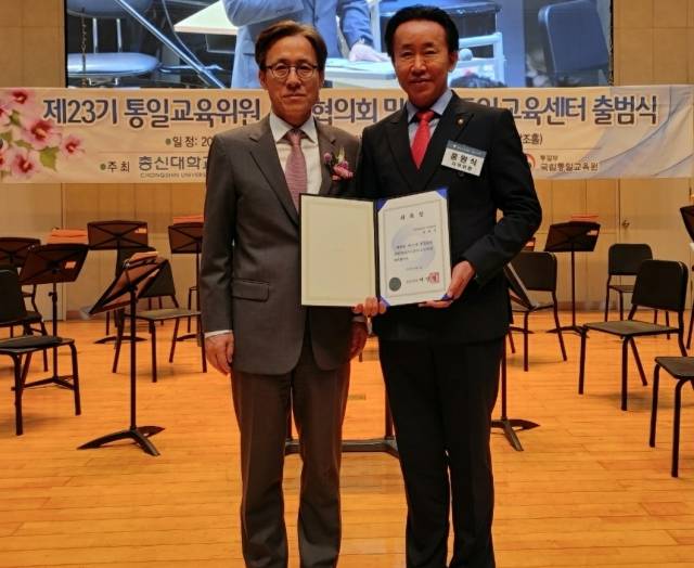 홍원식 국민통합비전 이사장이 26일 서울 사당동 총신대 강당에서 통일부 23기 통일교육위원 위촉장을 받고 있다. 왼쪽은 국립통일교육원 백준기 원장.