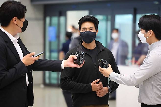 [27일 오전 인천국제공항 제1터미널에 귀국해 취재진 질문에 답하고 있는 이근 전 대위(영종도=연합뉴스)]
