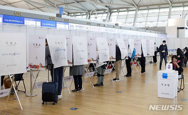 [인천공항=뉴시스] 최동준 기자 = 27일 인천국제공항에서 시민들이 해외로 출국 전 사전투표를 하고 있다. 2022.05.27. photocdj@newsis.com