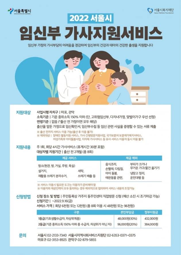 이 사업은 서울시의 '2022년 지역사회서비스투자사업'의 일환으로, 임신부 가정을 대상으로 바우처 카드를 지급을 통해 청소·설거지·세탁 등 각종 가사서비스 비용을 지원한다.