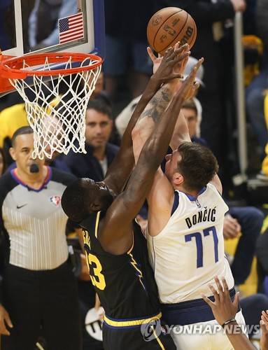epa09978891 Dallas Mavericks guard Luka Doncic (R), drives to the basket as Golden State Warriors forward Draymond Green (L) defends, during the first half of Game 5 of the NBA Western Conference Finals between the Golden State Warriors and the Dallas Mavericks, at Chase Center, in San Francisco, California, USA, 26 May 2022. The Golden State Warriors lead the best of seven series 3-1. EPA/JOHN G. MABANGLO SHUTTERSTOCK OUT