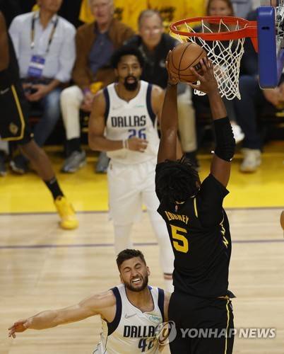 epa09978902 Golden State Warriors center Kevon Looney (R), slam dunks the ball past defending Dallas Mavericks forward Maxi Kleber (L), during the first half of Game 5 of the NBA Western Conference Finals between the Golden State Warriors and the Dallas Mavericks, at Chase Center, in San Francisco, California, USA, 26 May 2022. The Golden State Warriors lead the best of seven series 3-1. EPA/JOHN G. MABANGLO SHUTTERSTOCK OUT