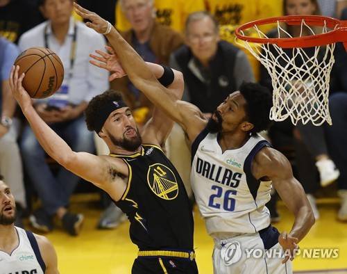 epa09978907 Dallas Mavericks guard Spencer Dinwiddie (R), looks to block the shot of Golden State Warriors guard Klay Thompson (L), during the first half of Game 5 of the NBA Western Conference Finals between the Golden State Warriors and the Dallas Mavericks, at Chase Center, in San Francisco, California, USA, 26 May 2022. The Golden State Warriors lead the best of seven series 3-1. EPA/JOHN G. MABANGLO SHUTTERSTOCK OUT