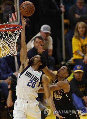 epa09978963 Dallas Mavericks guard Spencer Dinwiddie (L), takes a shot as Golden State Warriors guard Jordan Poole (R) defends, during the first half of Game 5 of the NBA Western Conference Finals between the Golden State Warriors and the Dallas Mavericks, at Chase Center, in San Francisco, California, USA, 26 May 2022. The Golden State Warriors lead the best of seven series 3-1. EPA/JOHN G. MABANGLO SHUTTERSTOCK OUT