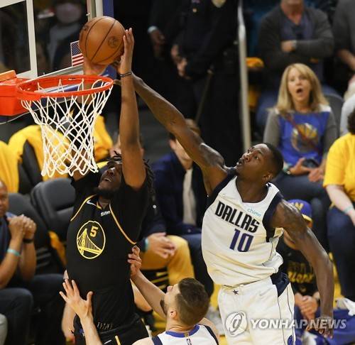 epa09978966 Golden State Warriors center Kevon Looney (L) shoots, as Dallas Mavericks forward Maxi Kleber (C), and Dallas Mavericks forward Dorian Finney-Smith (R) defend, during the second half of Game 5 of the NBA Western Conference Finals between the Golden State Warriors and the Dallas Mavericks, at Chase Center, in San Francisco, California, USA, 26 May 2022. The Golden State Warriors lead the best of seven series 3-1. EPA/JOHN G. MABANGLO SHUTTERSTOCK OUT