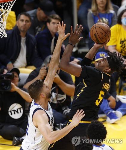 epa09978979 Golden State Warriors center Kevon Looney (R) shoots over defending Dallas Mavericks forward Maxi Kleber (L) during the second half of Game 5 of the NBA Western Conference Finals between the Golden State Warriors and the Dallas Mavericks, at Chase Center, in San Francisco, California, USA, 26 May 2022. The Golden State Warriors lead the best of seven series 3-1. EPA/JOHN G. MABANGLO SHUTTERSTOCK OUT