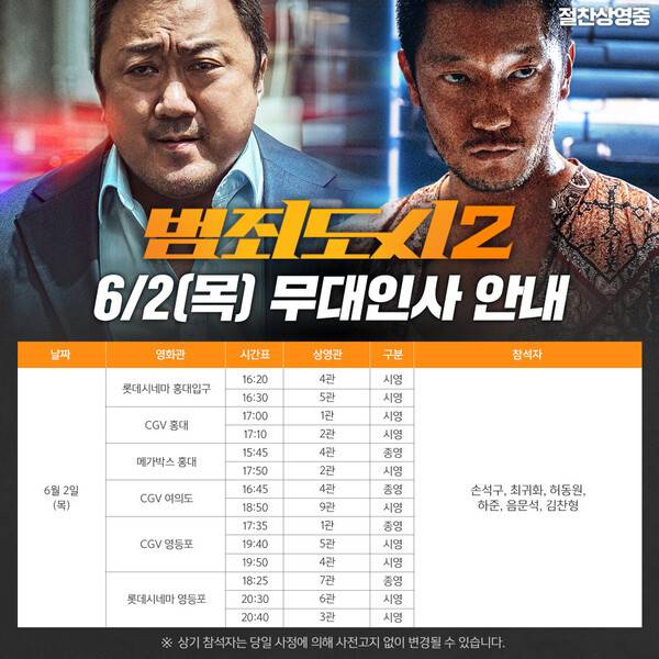 지난 3년 간 한국영화의 모든 흥행 신기록을 새로 쓴 영화 '범죄도시2'는 관객들의 성원에 보답하기 위해, 극장으로 직접 발로 뛰며 감사 인사를 전할 예정이다. 무대인사에 관한 자세한 내용은 ABO엔터테인먼트 인스타그램과 CGV, 롯데시네마, 메가박스 극장 예매 사이트의 PC 및 모바일 앱을 통해 확인할 수 있다.