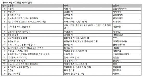 예스24 5월 4주 종합 베스트셀러 1위는 '무자본 연쇄창업마' 라이프해커 자청이 들려주는 인생 역주행 공식 '역행자'가 차지했다.