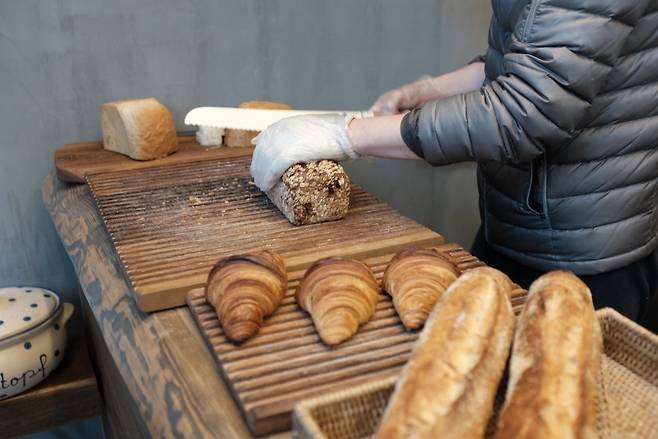 | ▲ 벨팡 대표가 손님이 주문한 빵을 자르고 있다. |