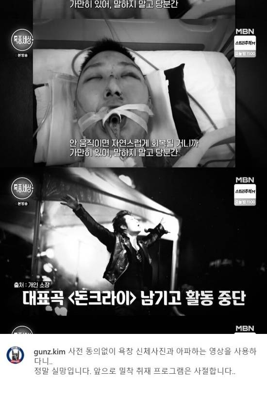 26일 업로드 된 김혁건의 인스타그램 게시글은 '특종세상'의 방송화면과 더불어 "사전 동의없이 욕창 신체사진과 아파하는 영상을 사용하다니. 정말 실망입니다. 앞으로 밀착 취재 프로그램은 사절합니다"라는 멘트가 덧붙여 있다.