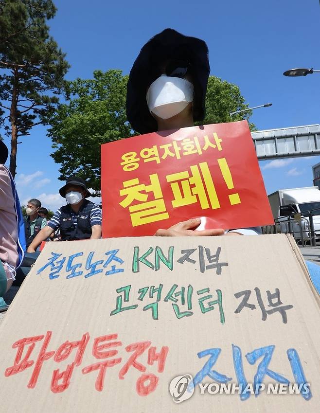 (서울=연합뉴스) 서대연 수습기자 = 27일 오후 서울 용산구 대통령 집무실 앞에서 열린 민주노총 철도노조 코레일네트웍스지부·철도고객센터지부 파업투쟁 결의대회에서 한 참가자가 팻말을 들고 있다. 2022.5.27