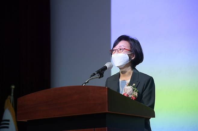 [오유경 신임 식품의약품안전처장이 27일 충북 청주시 식품의약품안전처에서 열린 취임식에서 취임사 하고 있다. (식품의약품안전처 제공=연합뉴스)]