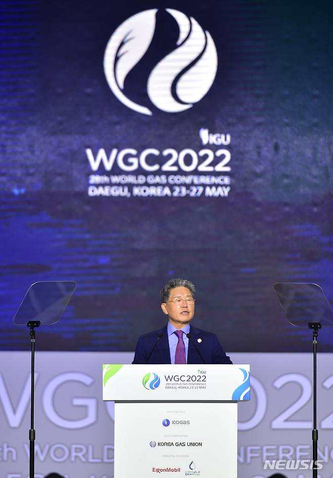 [대구=뉴시스] 이무열 기자 = 강주명 국제가스연맹(IGU) 회장이 27일 오후 대구 북구 엑스코에서 열린 ‘2022 세계가스총회’ 폐막식에서 폐회 연설을 하고 있다. 2022.05.27. lmy@newsis.com