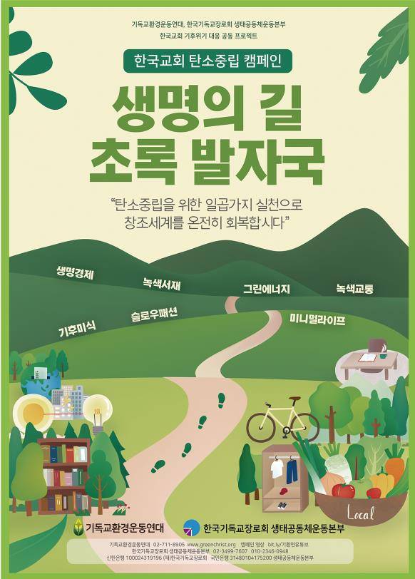 한국교회 탄소 중립 캠페인의 핵심 프로젝트인 ‘생명의 길 초록발자국’은 영성적 실천 방안으로 ‘7가지 기후행동’을 제시한다. 7가지 기후 행동에는 ‘기후 미식(식생활)’ ‘슬로 패션(패션)’ ‘미니멀 라이프(주거)’ ‘녹색 교통(교통)’ ‘그린 에너지(에너지)’ ‘녹색 서재(문화)’ ‘생명의 경제(경제)’로 구분해 생활 영역에서 탄소 배출을 최소화하는 행동 양식을 담아냈다.