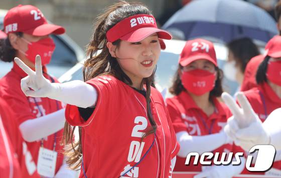 (구미=뉴스1) 정우용 기자 = 27일 오후 경북 구미 선산시장에서 열린 국민의힘 김장호 구미시장 후보 선거유세에서 이철우 경북지사 선거운동원들이 음악에 맞춰 율동을 하며 지지를 호소하고 있다. 2022.5.27/뉴스1