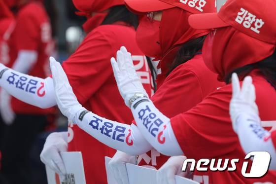 (구미=뉴스1) 정우용 기자 = 27일 오후 경북 구미 선산시장에서 열린 국민의힘 김장호 구미시장 후보 선거유세에서 선거운동원들이 음악에 맞춰 율동을 하며 지지를 호소하고 있다. 2022.5.27/뉴스1