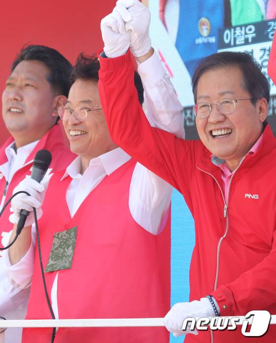 손 맞잡은 이철우 경북지사 후보와 홍준표 대구시장 후보