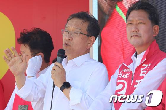 (구미=뉴스1) 정우용 기자 = 27일 오후 경북 구미 선산시장에서 열린 국민의힘 김장호 구미시장 후보 선거유세에서 석동현 변호사가 지지를 호소하고 있다. 석 변호사는 "그냥 당선이 아니라 전국 최다 득표로 윤석열 정부에 힘을 실어 달라 "며 전폭적인 지지를 호소했다. 2022.5.27/뉴스1