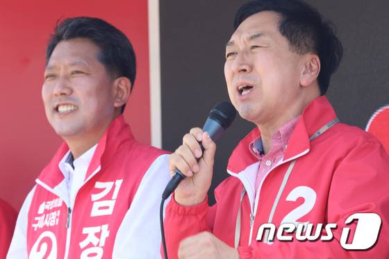 (구미=뉴스1) 정우용 기자 = 27일 오후 경북 구미 선산시장에서 열린 국민의힘 김장호 구미시장 후보 선거유세에서 김기현 공동선대위원장이 지지를 호소하고 있다. 김 위원장은 "대한민국 건국의 중심이 박 대통령의 고향 구미"라며 전폭적인 지지를 호소했다. 2022.5.27/뉴스1
