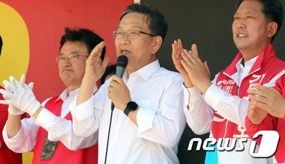 (구미=뉴스1) 정우용 기자 = 27일 오후 경북 구미 선산시장에서 열린 국민의힘 김장호 구미시장 후보 선거유세에서석동현 변호사가 지지를 호소하고 있다. 석 변호사는 "그냥 당선이 아니라 전국 최다 득표로 윤석열 정부에 힘을 실어 달라 "며 전폭적인 지지를 호소했다. 2022.5.27/뉴스1