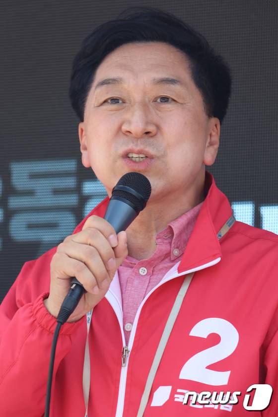 (구미=뉴스1) 정우용 기자 = 27일 오후 경북 구미 선산시장에서 열린 국민의힘 김장호 구미시장 후보 선거유세에서 김기현 공동선대위원장이 지지를 호소하고 있다. 김 위원장은 "대한민국 건국의 중심이 박 대통령의 고향 구미"라며 전폭적인 지지를 호소했다. 2022.5.27/뉴스1