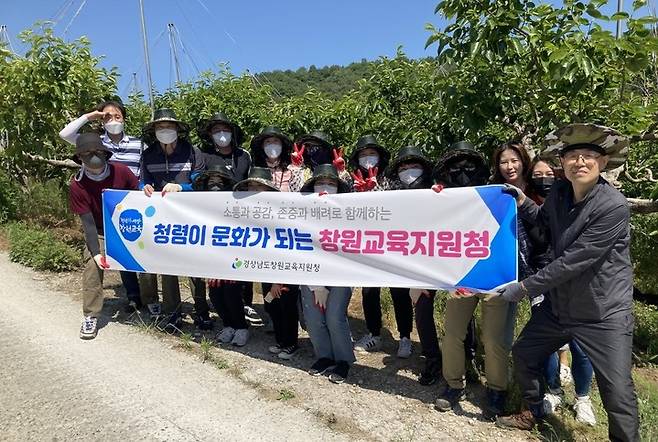 창원교육지원청 직원 20여 명은 창원시 의창구 북면 외산리 명촌마을 단감재배농가를 방문해 감꽃솎기 봉사활동을 했다.