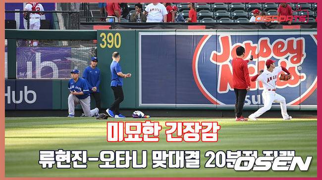 선발 투수 첫 맞대결을 펼친 '코리안몬스터' 류현진과 '이도류' 오타니 쇼헤이가 경기 전 웜업부터 미묘한 거리로 긴장감을 불러일으켰다.