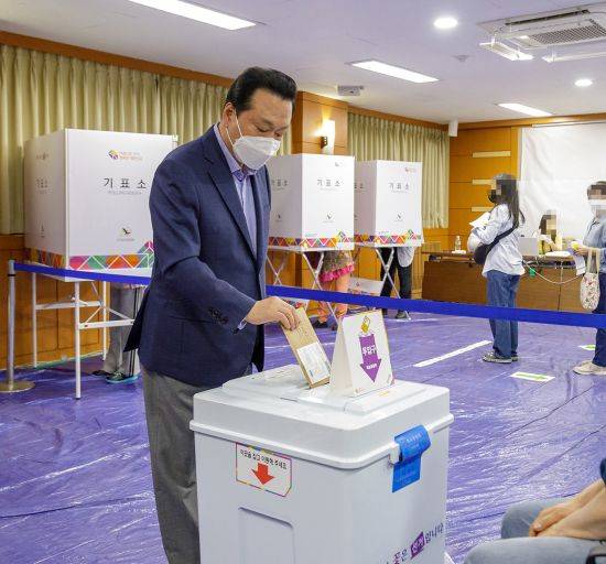 노현송 서울 강서구청장은 제8회 전국동시지방선거 첫날인 27일 오전 강서구청 3층 대회의실에 마련된 화곡제6동 사전투표소에서 투표를 마쳤다.