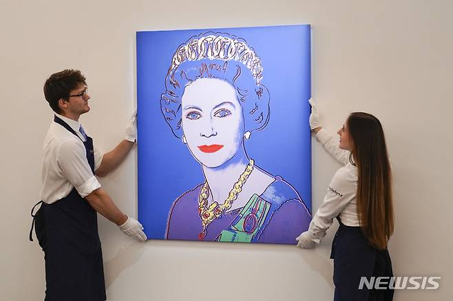 [런던=AP/뉴시스] 27일(현지시간) 영국 런던의 소더비에서 이곳 관계자들이 앤디 워홀의 1985년 작 '엘리자베스 2세 영국 여왕' 작품을 전시하고 있다. 이 전시회는 엘리자베스 2세 여왕 즉위 70주년을 맞는 플래티넘 주빌리를 앞두고 열린다. 2022.05.27.