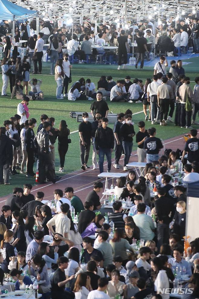 [서울=뉴시스] 권창회 기자 = 한양대 축제 '2022 라치오스'가 열린 27일 오후 서울 성동구 한양대 운동장에서 학생들이 축제를 즐기고 있다. 2022.05.27. kch0523@newsis.com