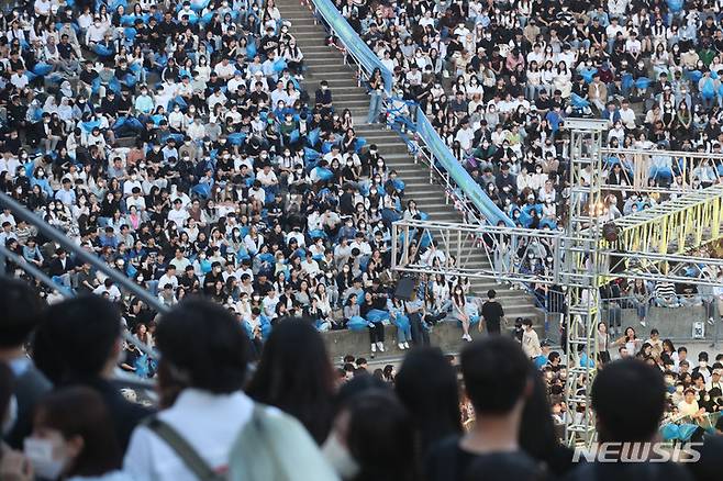 [서울=뉴시스] 권창회 기자 = 한양대 축제 '2022 라치오스'가 열린 27일 오후 서울 성동구 한양대 캠퍼스에서 학생들이 공연을 즐기고 있다. 2022.05.27. kch0523@newsis.com