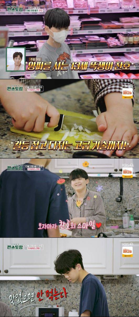 둘째 찬호는 일어나자마자 장을 보고 돌아왔다. 요리 인생 3년차 찬호는 매의 눈으로 꼼꼼하게 체크하며 양파, 토마토, 치즈, 소시지 등을 능숙하게 구매했다. 집으로 돌아와 주방으로 직행한 찬호는 아빠와 형을 위한 요리를 시작했다. 양파와 토마토, 파슬리를 잘게 손질해 살사 소스를 만든 찬호는 아빠와 형을 위해 소시지 등갈비를 준비해 감탄을 자아냈다.