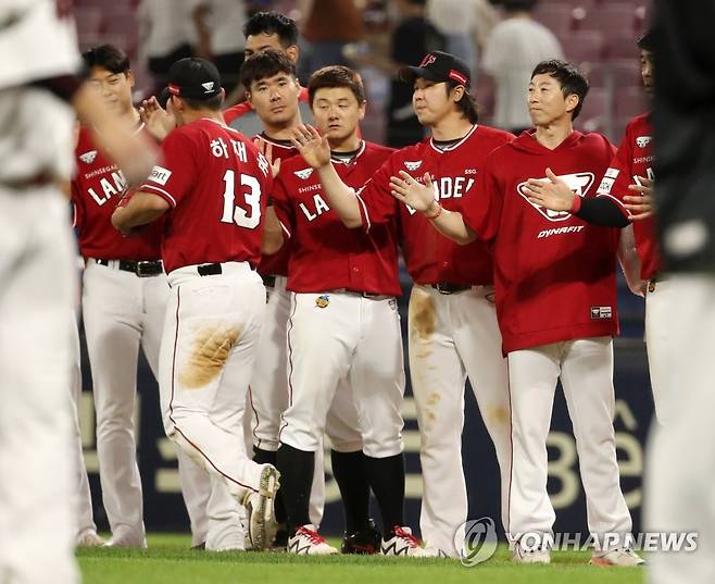 (광주=연합뉴스) 조남수 기자 = 27일 광주기아챔피언스필드에서 열린 프로야구 2022 KBO리그 SSG 랜더스와 KIA 타이거즈의 경기에서 8-1로 승리한 SSG 선수들이 기뻐하고 있다. 2022.5.27