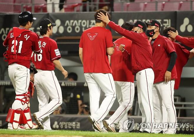 (광주=연합뉴스) 조남수 기자 = 27일 광주기아챔피언스필드에서 열린 프로야구 2022 KBO리그 SSG 랜더스와 KIA 타이거즈의 경기에서 8-1로 승리한 SSG 김원형 감독이 승리투수 이태양을 격려하고 있다. 2022.5.27