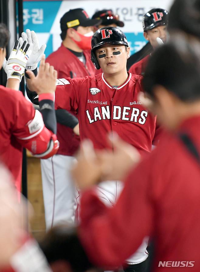 [광주=뉴시스] 류형근 기자 = 27일 오후 광주 북구 광주-기아챔피언스필드에서 열린 2022프로야구 KIA 타이거즈 대 SSG 랜더스의 경기, 9회초 1사 1, 2루에서 SSG 1번타자 추신수가 3점 홈런을 친 뒤 하이파이브 하고 있다. 2022.05.27. hgryu77@newsis.com