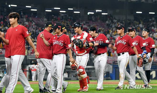 [광주=뉴시스] 류형근 기자 = 27일 오후 광주 북구 광주-기아챔피언스필드에서 열린 2022프로야구 KIA 타이거즈 대 SSG 랜더스의 경기, SSG가 8-1 승리를 거둔 뒤 하이파이브 하고 있다. 2022.05.27. hgryu77@newsis.com